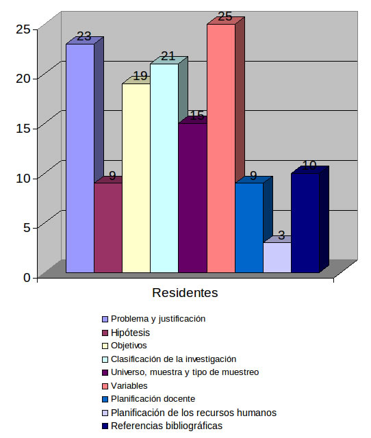En 23 residentes existieron dificultades en los planteamientos de la situación y el problema. En la justificación de la investigación, la explicación y análisis se ofrecían a nivel internacional y de país; pero no contextualizan el problema de salud a su municipio o área de salud.