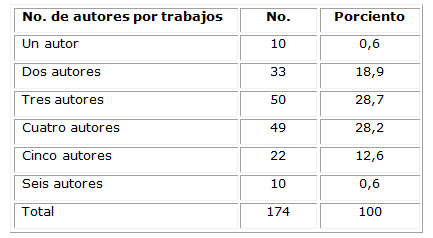 Destacaron los trabajos con tres autores para un total de 50 presentados equivalentes al 28,73 %, según muestra la Tabla 1. De un total de 592 autores, 337 fueron estudiantes y 254 profesionales (56,92 % y 42,90 % respectivamente).