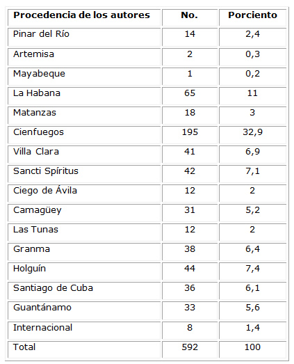 Procedencia de los autores: Pinar del Río, Artemisa, Mayabeque, La Habana, Matanzas, Cienfuegos, Villa Clara, Sancti Spíritus, Ciego de Ávila, Camagüey, Las Tunas, Granma, Holguín, Santiago de Cuba, Guantánamo, Internacional.