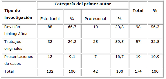 Destacaron las investigaciones estudiantiles (132; 75,9 %) con un predominio de las revisiones bibliográficas (88; 66,7%, de un total de 98; 56,3 %), lo cual se presenta en la Tabla 3.