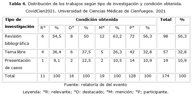 Los trabajos aceptados se distribuyeron en un total de 15 salones (11 para estudiantes y cuatro para profesionales). La evaluación se realizó mediante un tribunal compuesto por tres miembros (presidente, secretario y vocal), responsables de la evaluación crítica de las investigaciones desde el punto de vista metodológico y científico, según la temática y las normas establecidas. El número de premiaciones otorgadas sustentan el rigor científico del evento, en especial a partir del número de condiciones relevantes; estos resultados coinciden con los presentados por Reyes-Ávila;(8) sin embargo, discrepan de los presentados por Torrecilla Venegas et al.(9) El predominio de investigaciones estudiantiles y de revisiones bibliográficas permite establecer un nexo entre ellos.