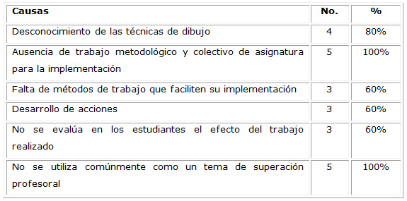 Las principales causas del poco aprovechamiento de las potencialidades del dibujo anatómico en las diferentes asignaturas, mostradas en la Tabla 1, indican que la preparación de los profesores para la dirección del desarrollo de habilidades en los estudiantes basado en el dibujo anatómico está afectada fundamentalmente por la falta de trabajo metodológico para su implementación y la ausencia de estos temas en la superación profesoral, en opinión de los autores.